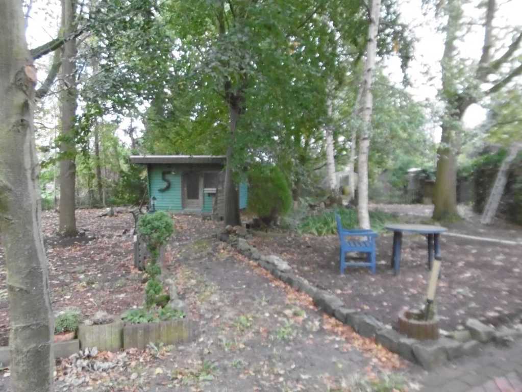 Garten mit altem Baumbestand und einer Gartenhütte