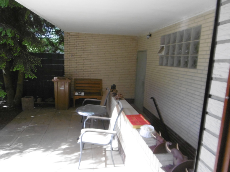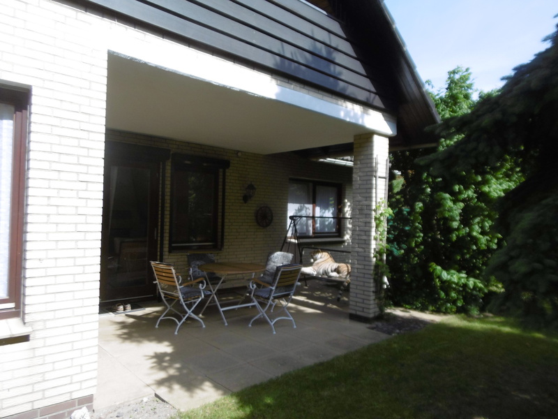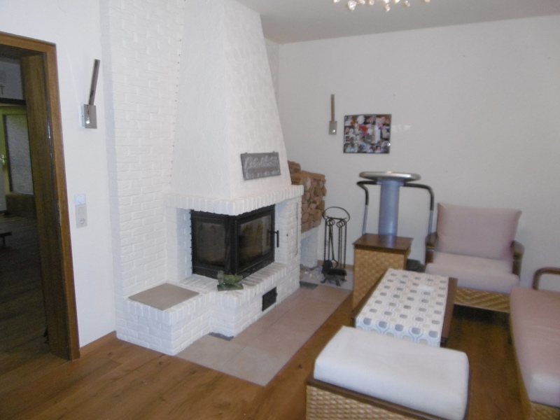 EG: Wohnzimmer, Kaminzimmer, Schlafzimmer, neuwertige, offene Küche zur Diele, neuwertiges Bad mit Wanne und Dusche, Abstellraum, Gäste-WC, große Diele, überdachte Terrasse.