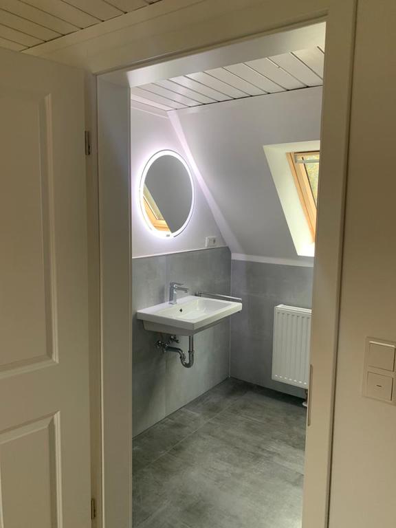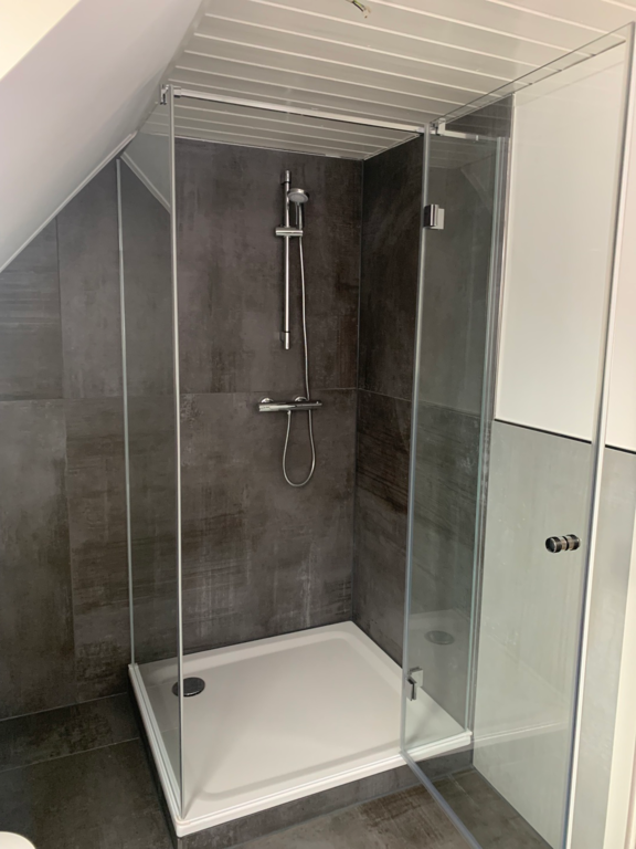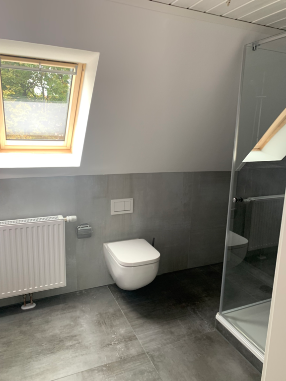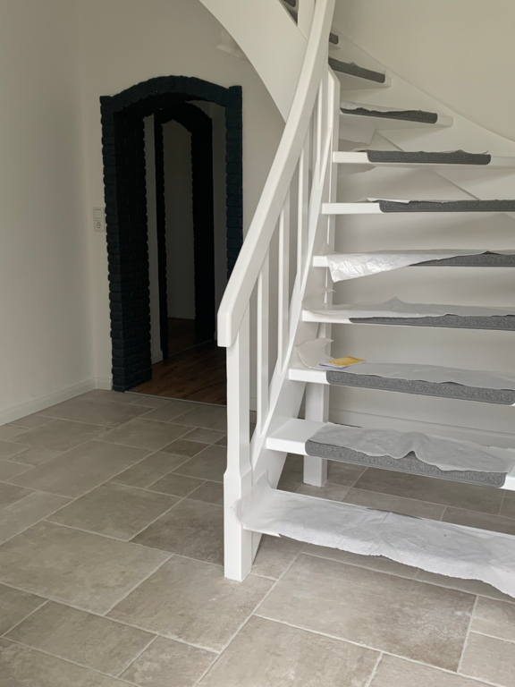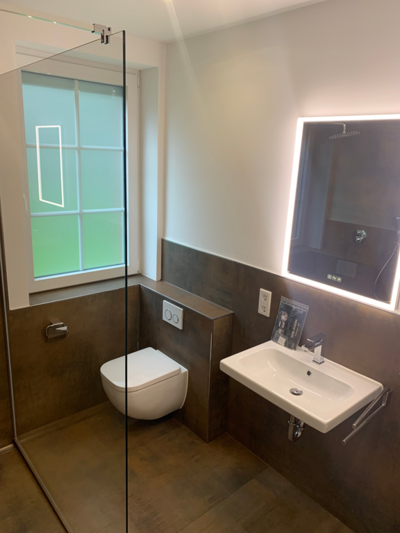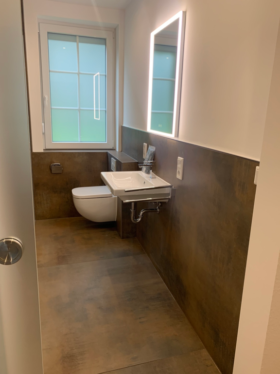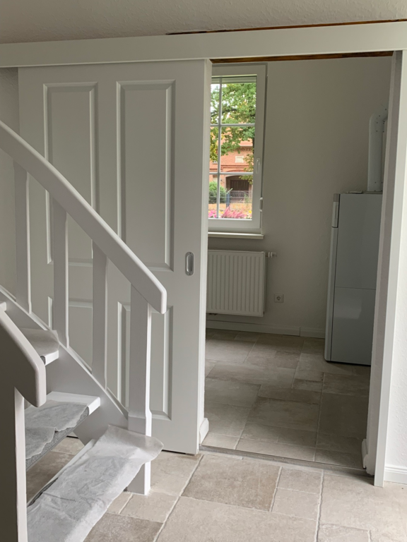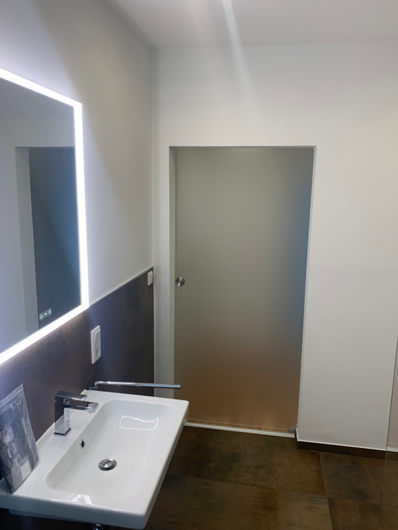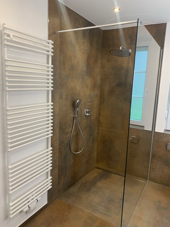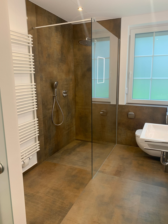 Im Erdgeschoss befindet sich ein ebenfalls völlig entkerntes und neu gebautes Bad mit zusätzlicher Fußbodenheizung und moderner Regendusche (Walk In Dusche mit Glasabtrennung) und luxuriösen Großformatfliesen der gehobenen Kategorie. Als Tür wurde eine moderne satinierte Glasschiebetür eingebaut. Alle Türen wurden neu eingebaut und auf den besonderen Stil des Hauses angepasst.