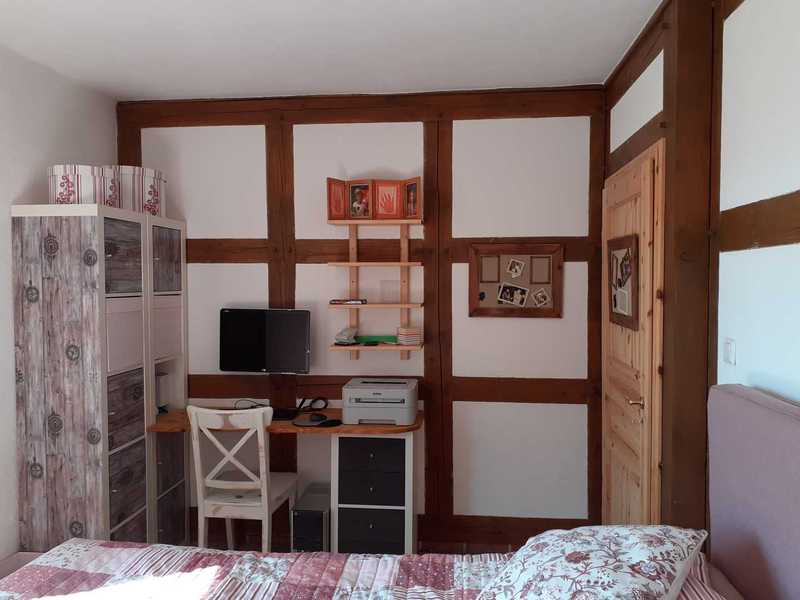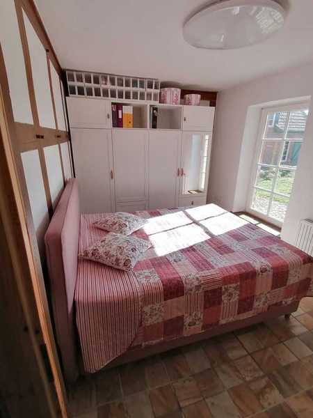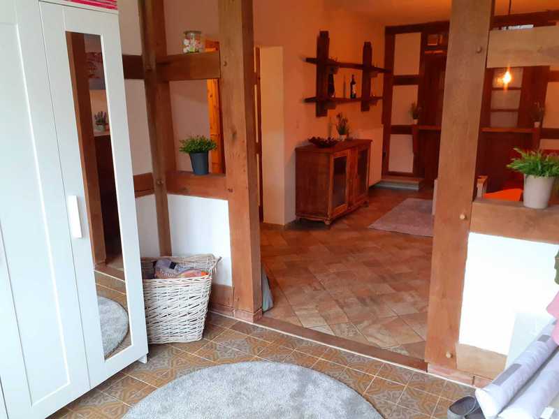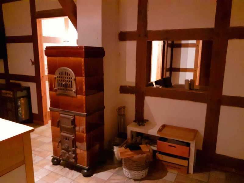 Haupthaus: Wohn-Esszimmer mit integrierter Küche, Schlafzimmer, HWR, Bad mit Dusche, Diele, Kachelofen. Von der Diele aus mit direktem Zugang zur Scheune.