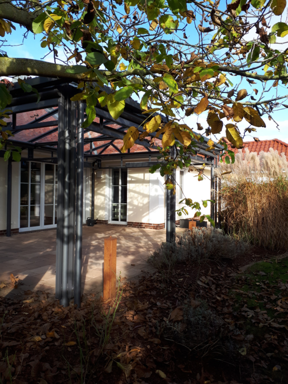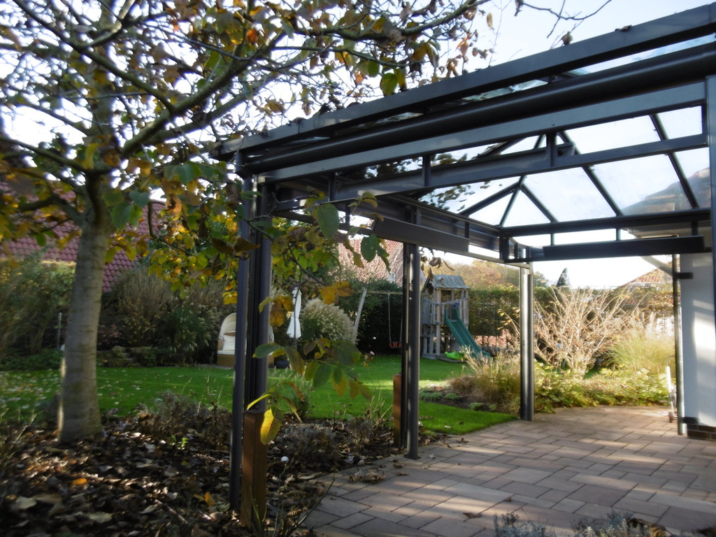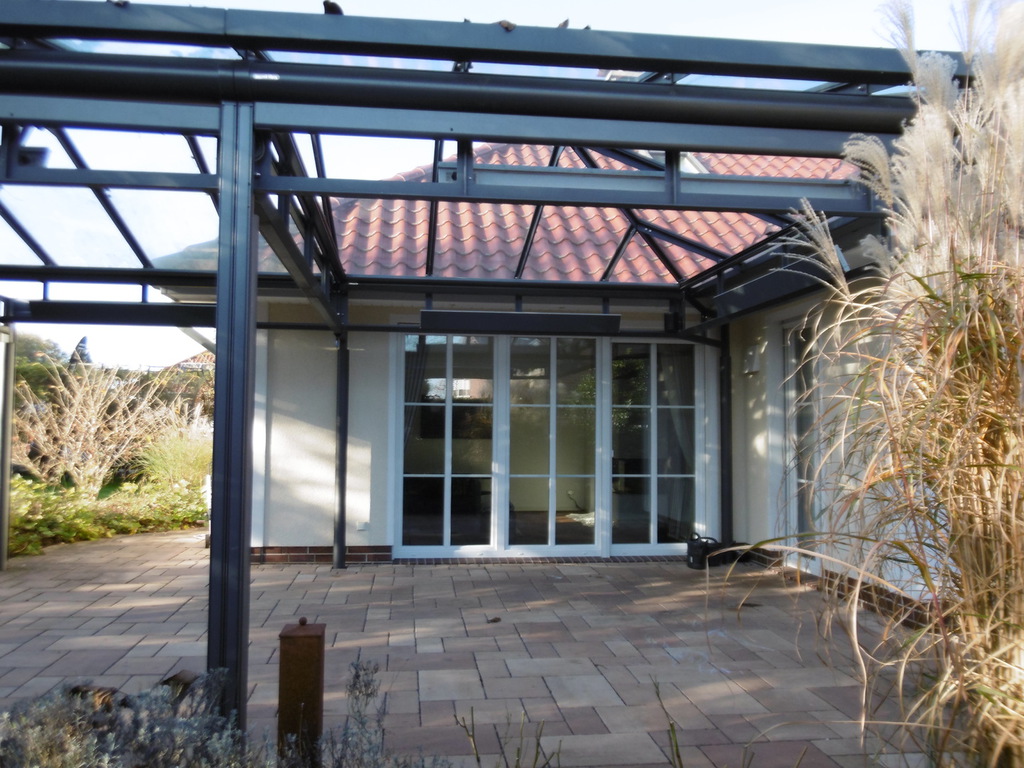 Terrasse: Natursteinpflaster, Überdachung als Stahlkonstruktion mit Glasplatten und Beschattung.