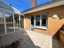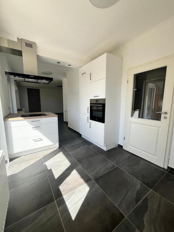 Moderne Einbauküche, Bad mit Wanne und ebenerdiger Dusche sowie zwei Balkone, von denen einer überdacht ist.